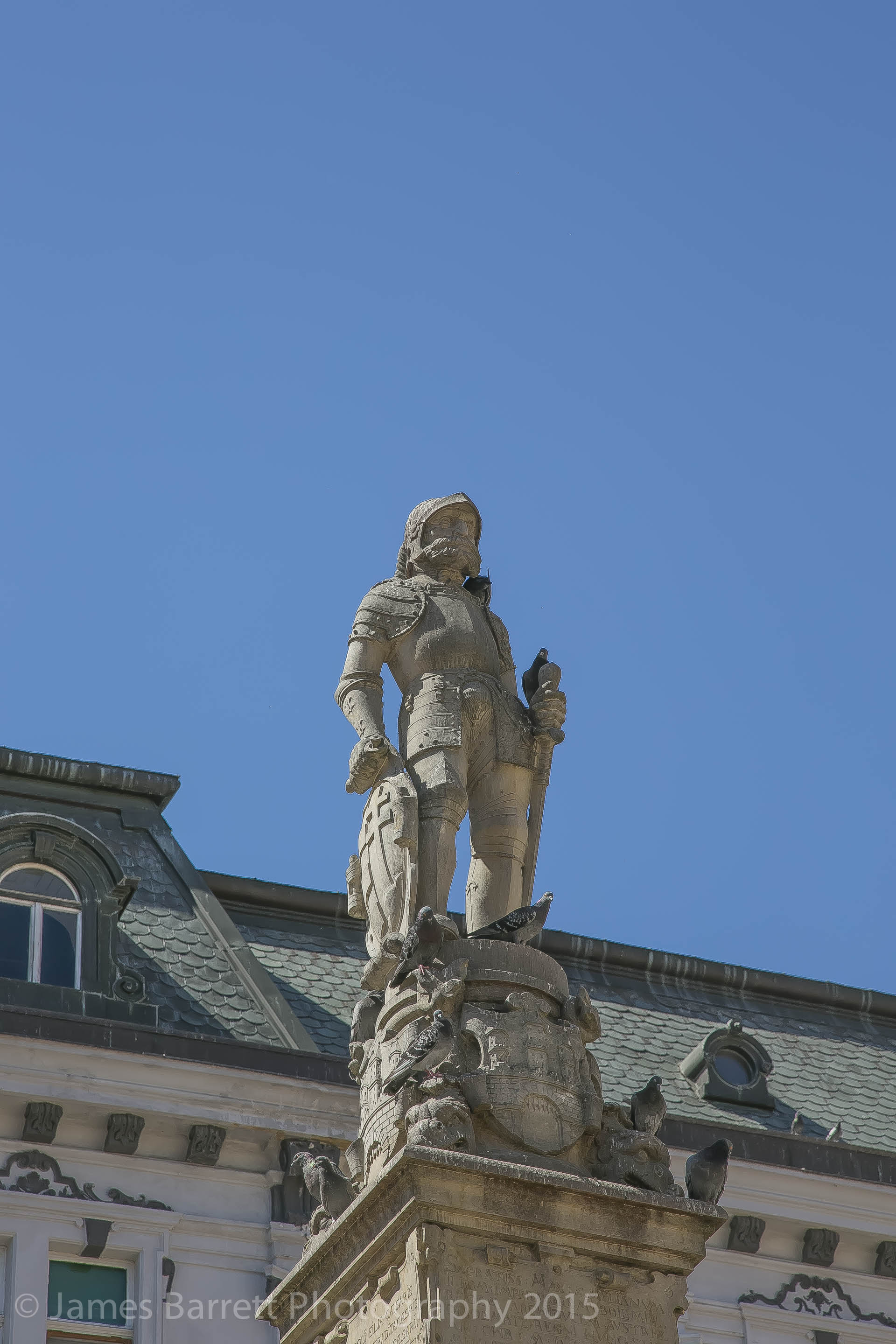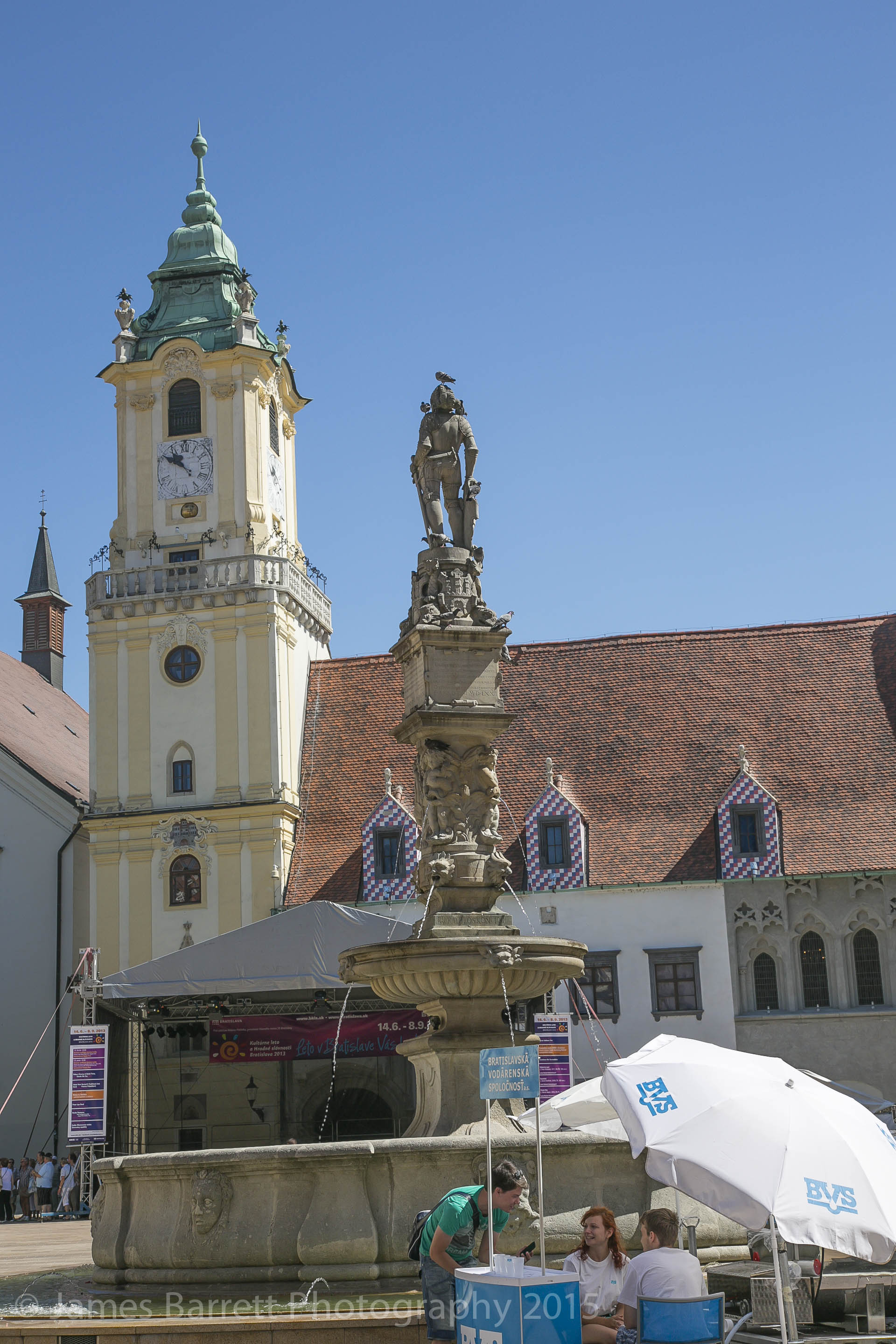 The Main Square of Old Town is anchored by the Roland Fountain, the most famous in Bratislava, topped by a statue of Maximilian in full armor. https://en.wikipedia.org/wiki/Roland_Fountain Behind the fountain lies the Old Town Hall which has a cannon ball imbedded into its wall. At one time, properties having such ordinance was free of taxation until property owners began implanting their buildings to avoid taxation. My pictures of this landmark are from our 2013 trip.