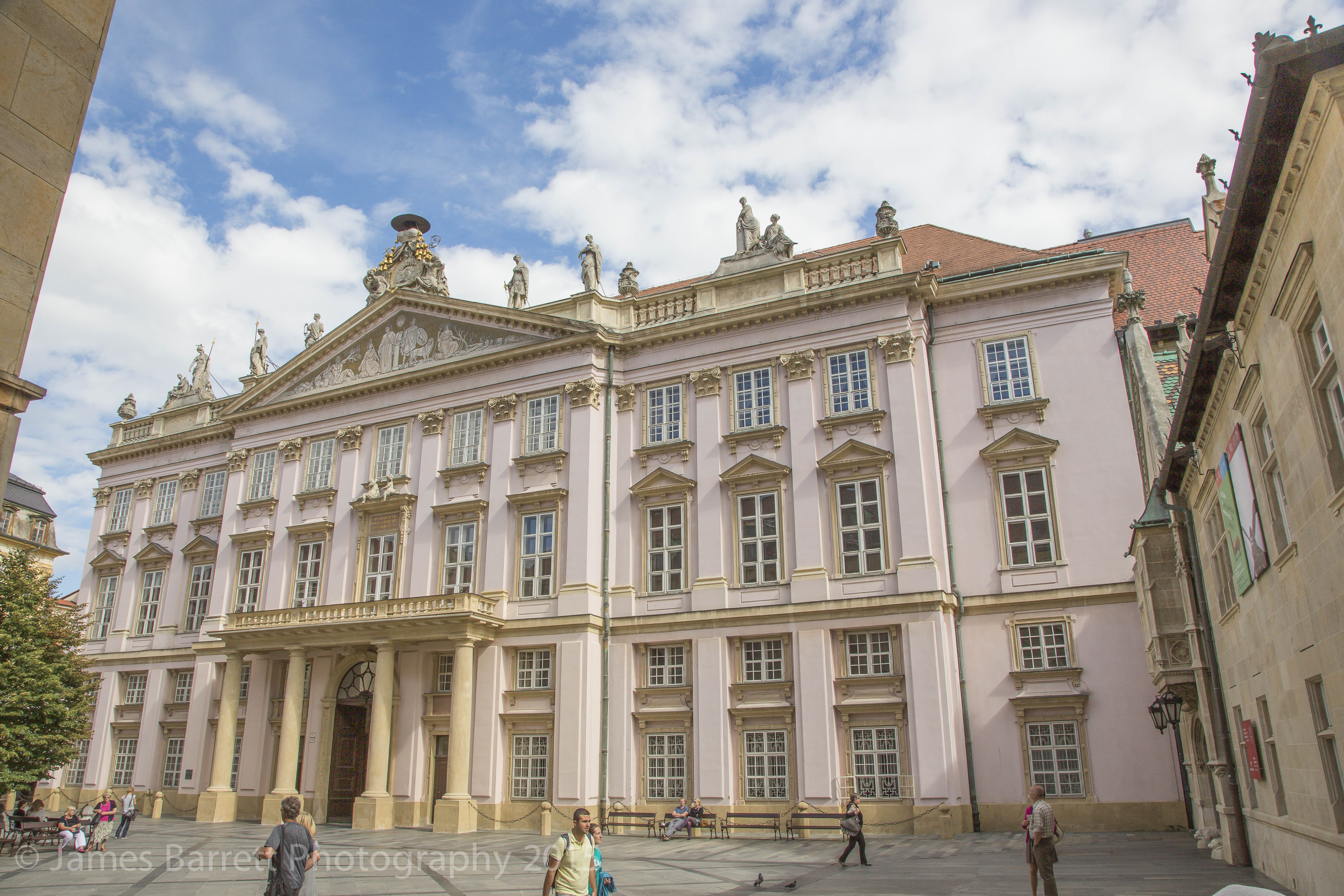 Surrounding the square are buildings with history, including the Old Town Hall, displaying a cannon ball imbedded into its wall. https://en.wikipedia.org/wiki/Old_Town_Hall_(Bratislava)
