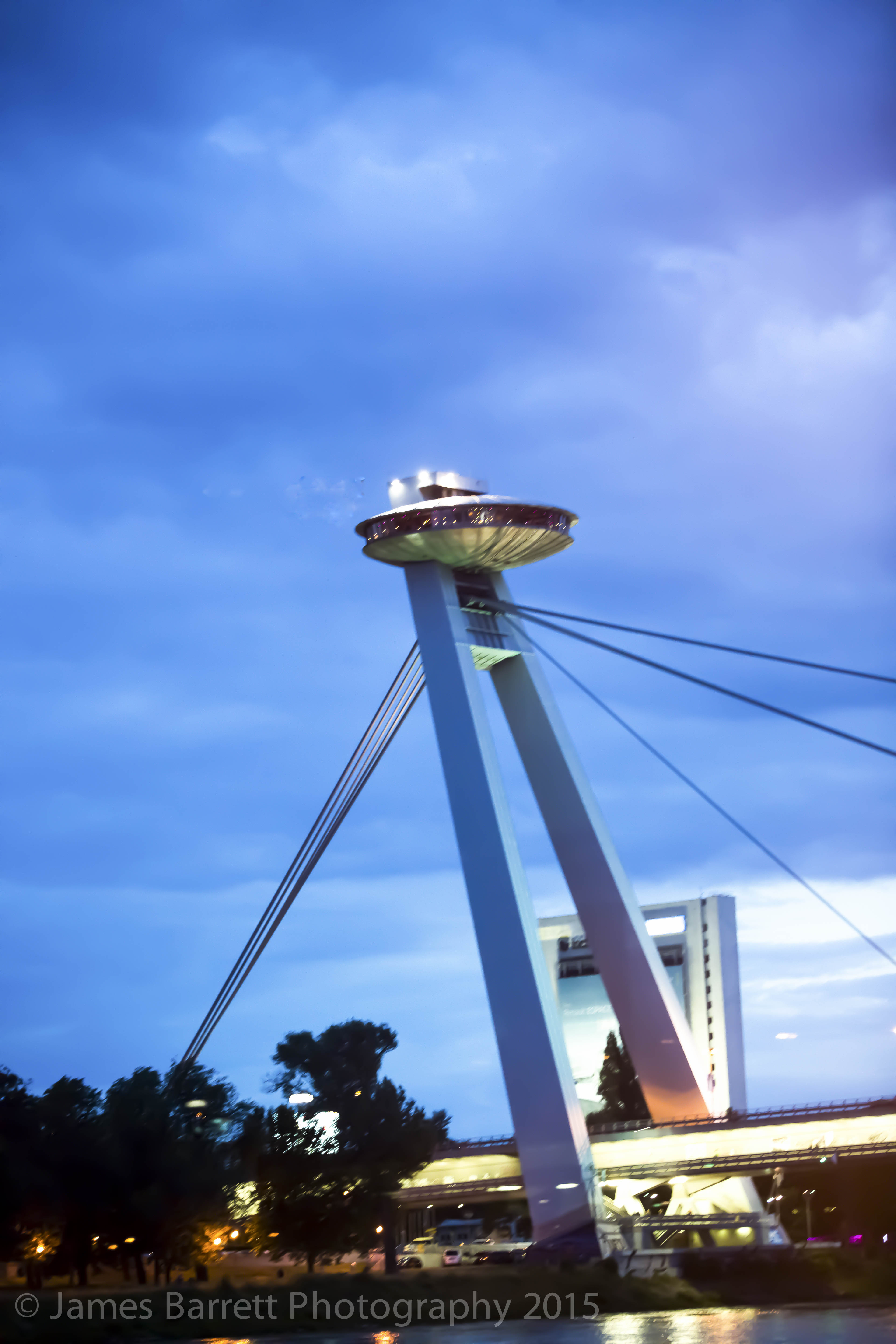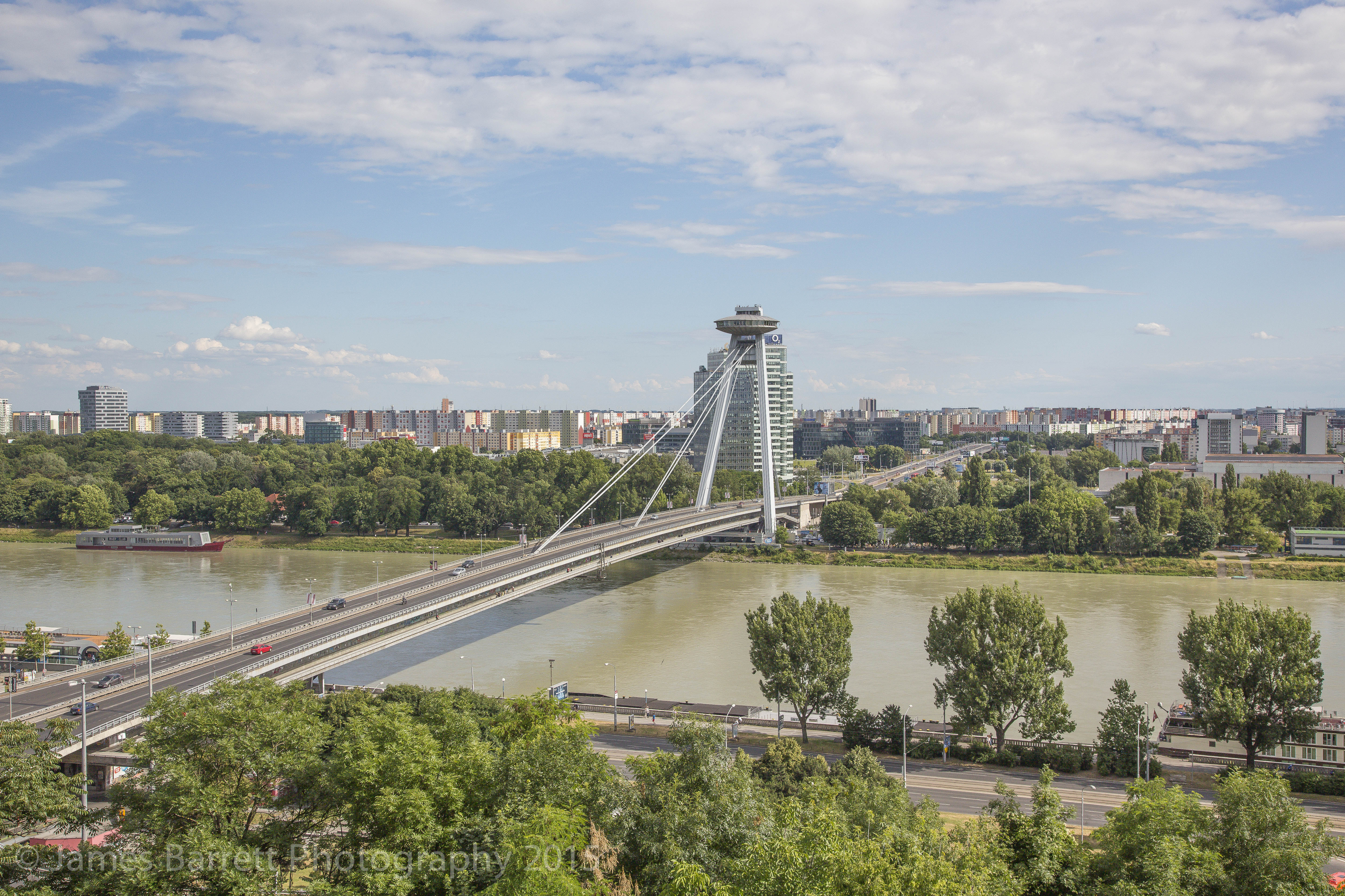 One of the modern symbols of the city is Restaurant UFO, a restaurant in the shape of a flying saucer atop the bridge SNP . http://www.bratislavahotels.com/favourites/restaurant-ufo/ This shot was taken in 2013 and is fuzzy: taken from a moving bus.