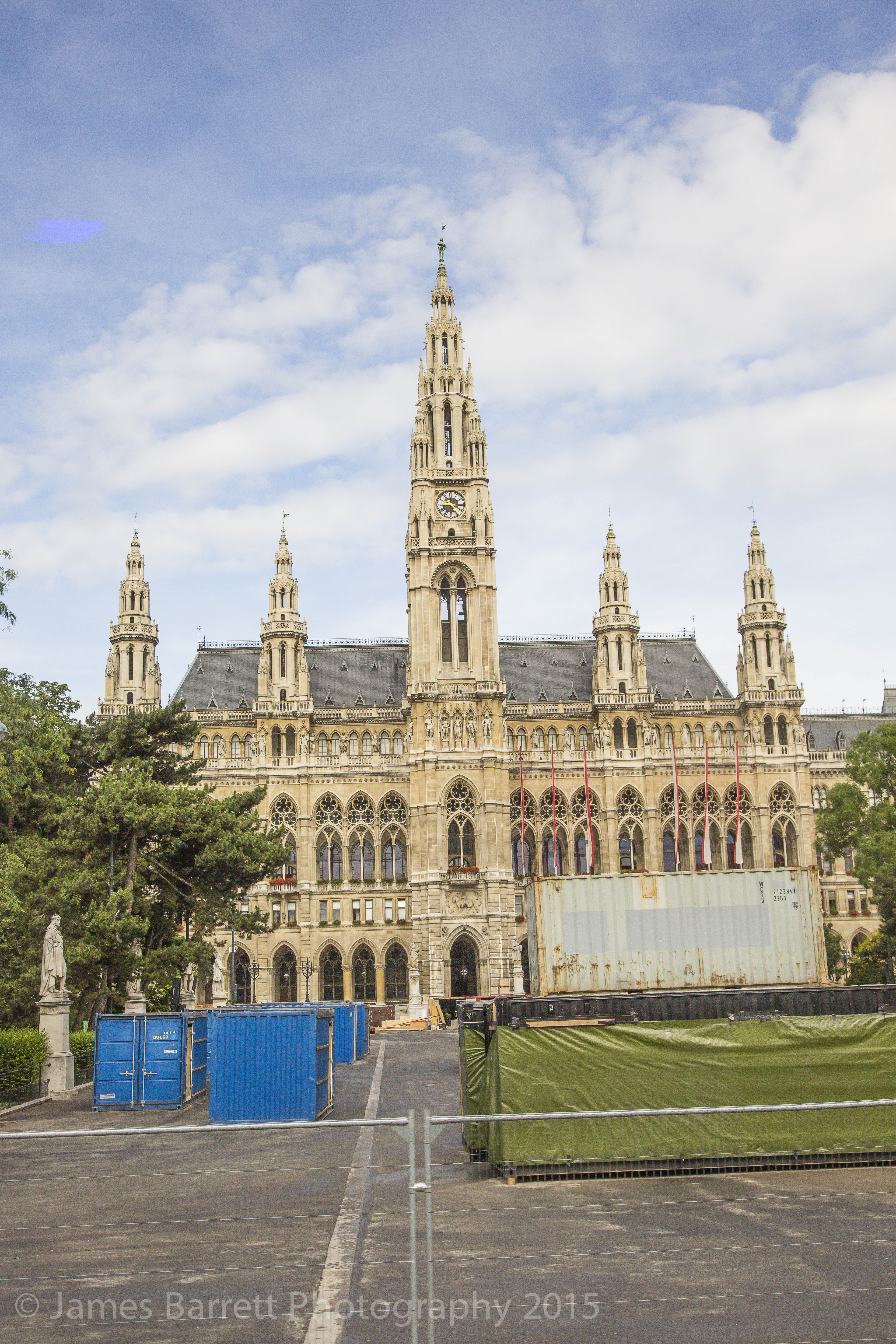 One the way back to the boat for lunch, we traversed a part of the Ring Strasse, the circumference of the Old Town where the wall had been. We passed many public buildings. I want to show you the Parliament https://en.wikipedia.org/wiki/Austrian_Parliament_Building built between 1874 – 1883 in the Greek Style, and the Rathause or Town Hall built about the same time in a Neo-Gothic style.: https://en.wikipedia.org/wiki/Rathaus,_Vienna